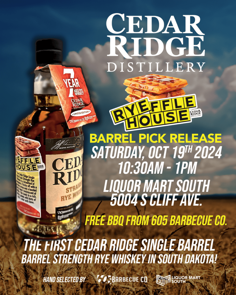 The food truck 605 Barbecue Co. has picked a private barrel of whiskey from Cedar Ridge Distillery in Swisher, Iowa. The seven-year-aged rye whiskey is available in 174 bottles that feature a QR code that leads to four curated barbecue recipes that feature the liquor. The bottled whiskey will be available beginning Friday at Liquor Mart South, 5004 S. Cliff Ave. At a launch party from 10:30 a.m. to 1 p.m. Saturday at the liquor store, 605 Barbecue will be giving out free barbecue featuring whiskey-inspired ingredients.