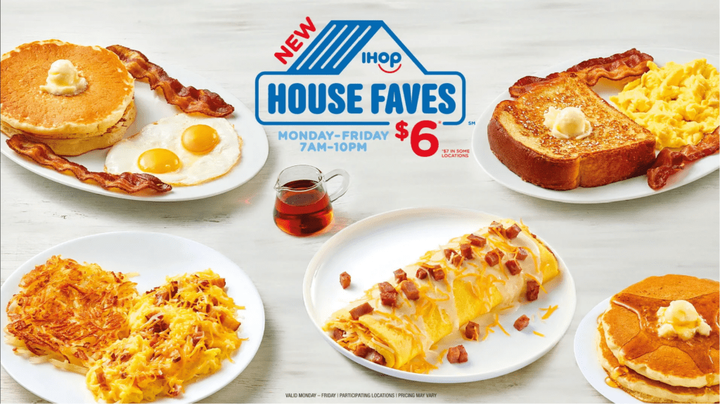 IHOP has a new value menu for weekdays. House Faves are available for $6 from 7 a.m. to 10 p.m. weekdays. Choices include the Breakfast Faves Combo, House Scramble, Ham & Cheese Omelet and French Toast Breakfast.