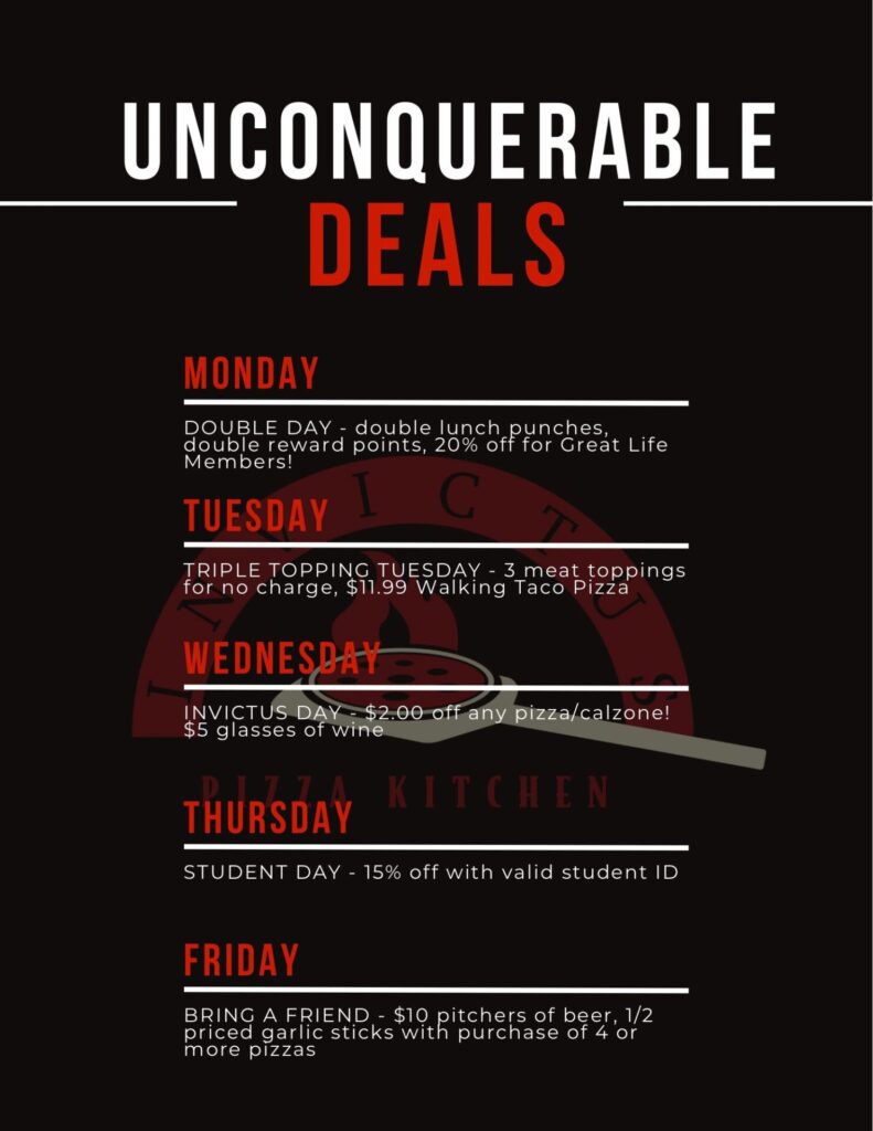 Check out the new daily deals at Invictus Pizza Kitchen.