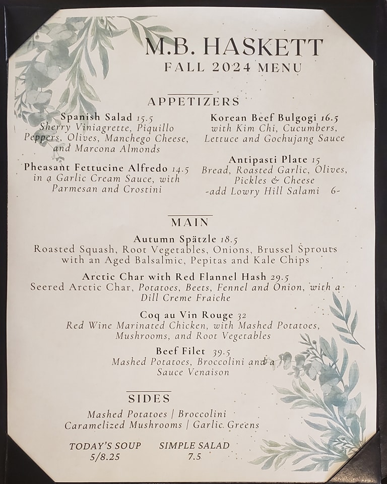 M.B. Haskett has a new dinner menu for fall. “This menu is full of some favorites, as well as some new selections for you to enjoy,” the restaurant said in a post on social media. Dinner is served from 5 to 9 p.m. Thursday through Saturday.