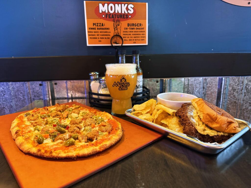 New features at Monks Ale House are the Vinnie Barbarino pizza and the Chi-Town Smashy burger. The pizza has vodka sauce, mozzarella, sausage, hot giardiniera and a pecorino and Parmesan blend. The burger is a double onion smashburger with provolone and giardiniera aioli on a potato roll with beef au jus for dipping and a side of chips.