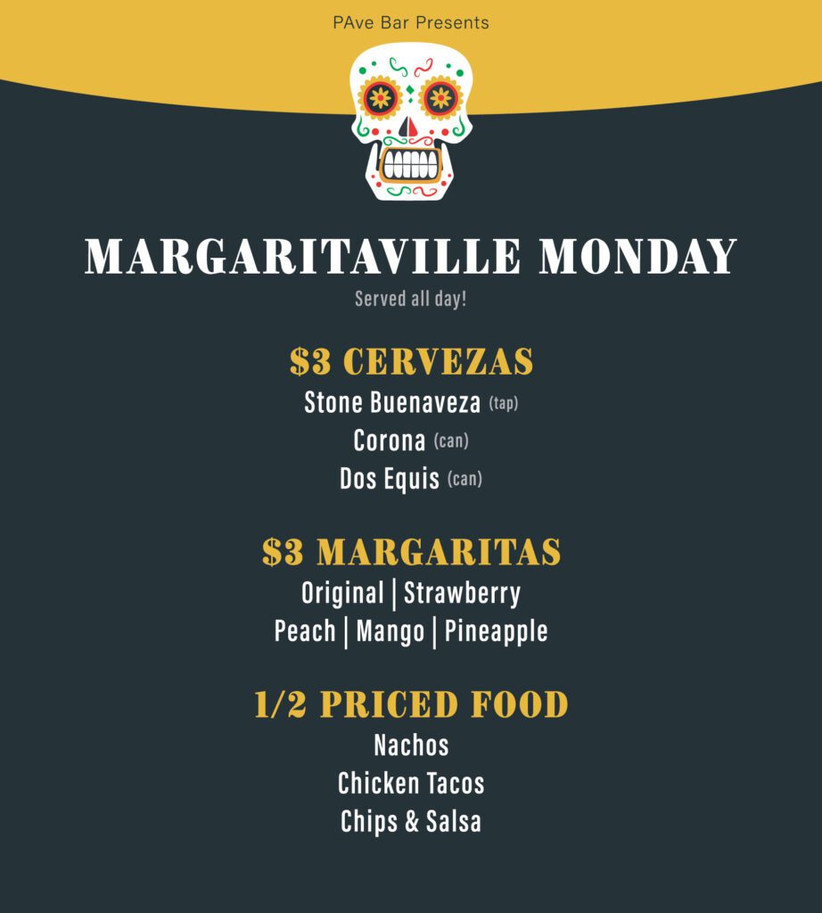 If you’re tired of Taco Tuesday, PAve has created Margaritaville Mondays. Get half-priced chicken tacos, nachos, and chips and salsa all day at the downtown bar and restaurant. For drink specials, there are $3 Mexican beers and $3 margaritas in five flavors.