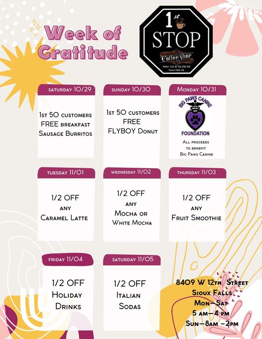 First Stop Coffee Shop at 12th and Ellis, is celebrating a Week of Gratitude. It kicks off Saturday with a free breakfast burrito for the first 50 customers. Sunday, the early birds will get a free Flyboy Donut. On Monday, all proceeds will go to the Big Paws Canine Foundation, which provides service dogs to disabled veterans and first responders. From Tuesday through Nov. 5, customers will get different drinks each day at half-price.