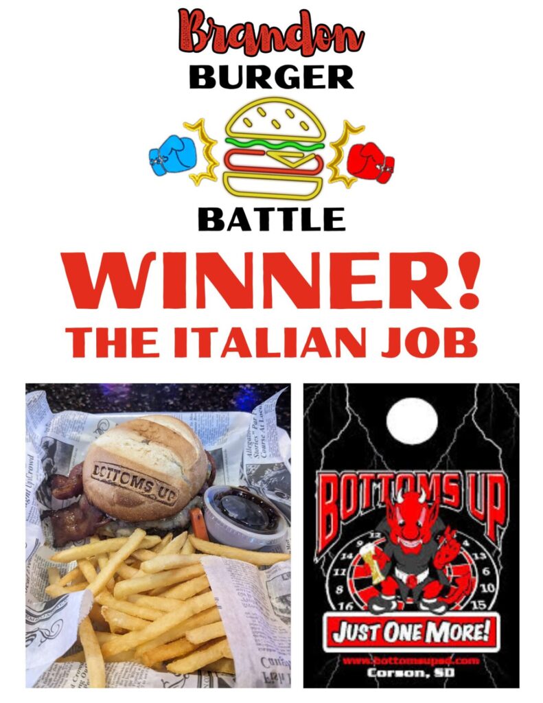 The winner of the Brandon Burger Battle, which included eight businesses in the Brandon area, was Bottoms Up in Corson. The winning burger, The Italian Job, will be back on the bar’s menu beginning Tuesday, and it may have earned a permanent spot. It’s a seasoned Wagyu beef patty with black truffle aioli, asiago cheese, raspberry chipotle bacon and giardiniera on a toasted bun.