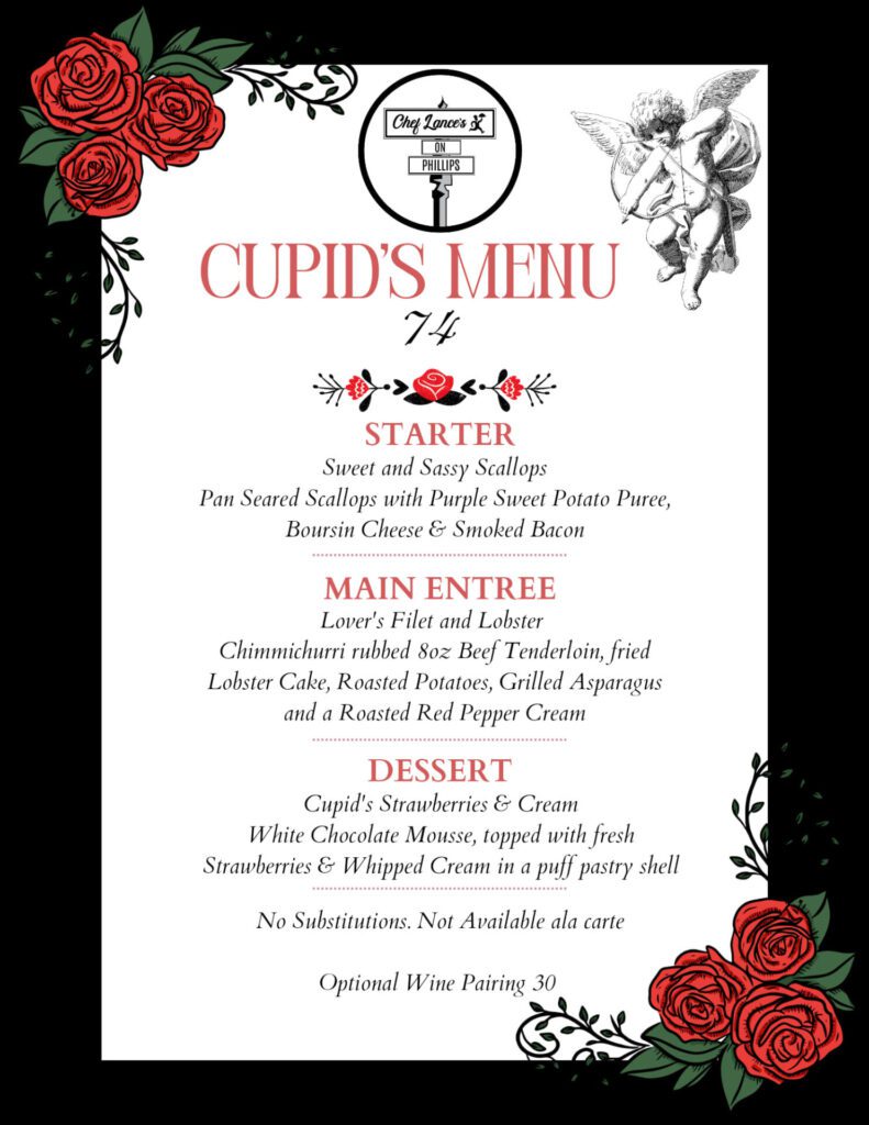 The featured three-course menu for February at Chef Lance’s on Phillips includes scallops for the starter, beef tenderloin and a fried lobster cake as the entree and Cupid’s Strawberries & Cream for dessert.