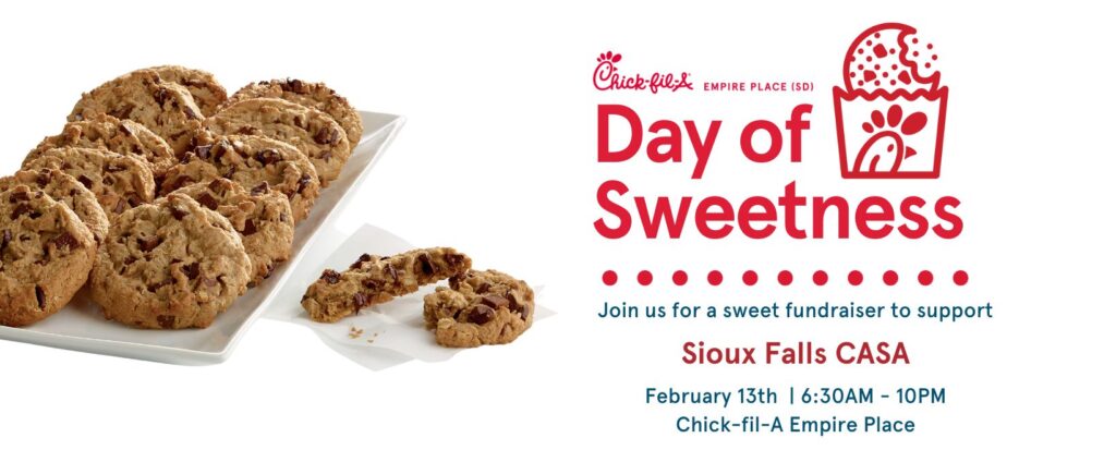 Chick-fil-A is having its annual Day of Sweetness fundraiser Wednesday to benefit the Sioux Falls Area Court Appointed Special Advocate Program. All proceeds from the sale of cookies and brownies will go to CASA, which seeks to promote and protect the best interests of abused and neglected children through the advocacy efforts of trained community volunteers.