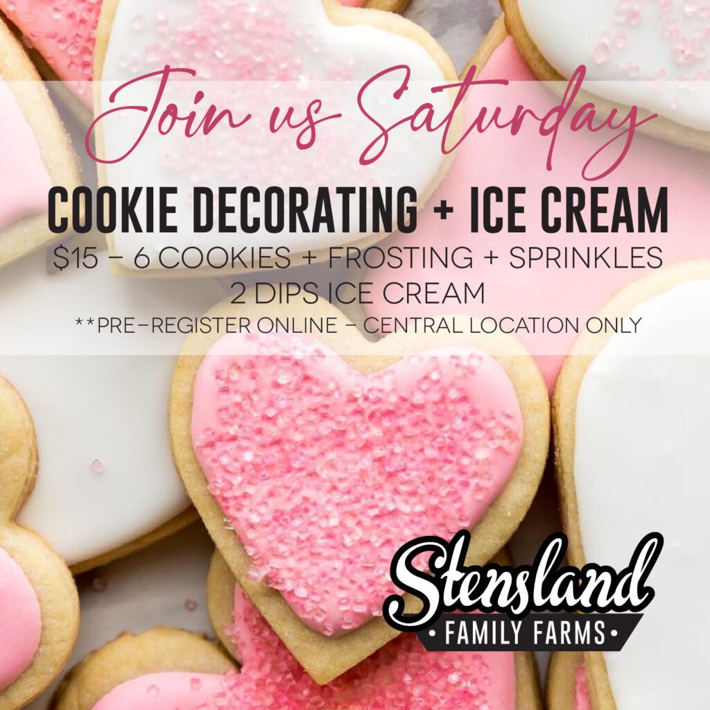 Stensland Family Farms is having a Valentine’s cookie decorating party Saturday at the central store. For $15, you’ll get six heart-shaped sugar cookies with frosting and sprinkles to decorate, plus two dips of ice cream. Pre-register online, and then drop in anytime from 3 to 5 p.m.