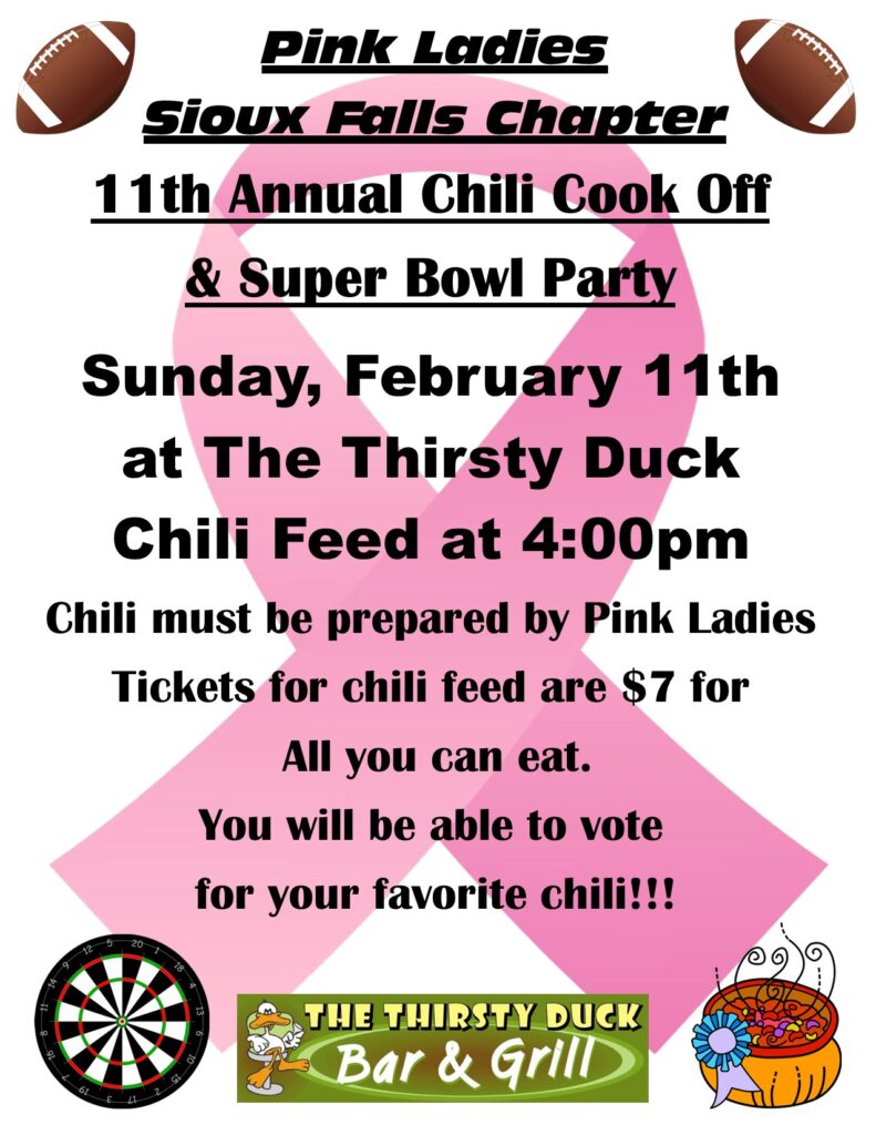 The Thirsty Duck Bar & Grill is hosting a fundraiser for the Sioux Falls chapter of Pink Ladies. It’s the 11th annual chili cook-off and Super Bowl party. Members of the group will make chili, and tickets are $7 for all you can eat. Diners can vote for their favorite. The chili feed starts at 4 p.m. Sunday.