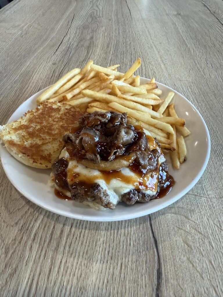 The burger of the month at Alibi Bar & Grill is The Luke Burger. The one-third-pound patty is topped with Swiss cheese, and an onion ring that’s filled with shaved prime rib and drizzled with a sweet and spicy chili garlic sauce. It comes with a choice of side for $14.