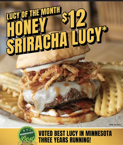 The May lucy of the month at Crooked Pint Ale House is honey sriracha. It’s stuffed with pepper jack cheese and topped with Monterey Jack, fried jalapenos, haystack onions, mayo and honey sriracha sauce. It’s served with a choice of side for $12.