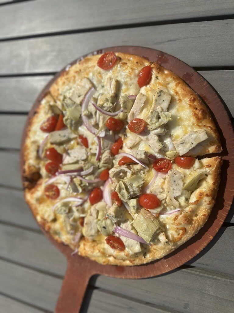 The featured pizza for May at Invictus Pizza Kitchen is The Drac Snack with garlic aioli, mozzarella, feta, gouda, grilled chicken, red onion, roasted garlic, artichoke and marinated tomato, finished with garlic rosemary oil.