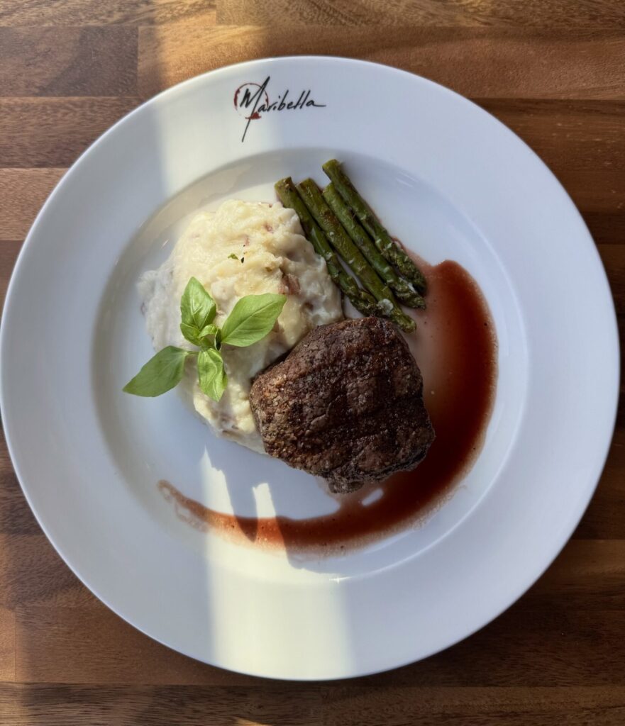 At sister restaurant Maribella, the monthly feature is Filetto di Manzo. An 8-ounce beef filet is paired with port wine reduction, served over cauliflower garlic mashed potatoes, with asparagus tips and finished with truffle.