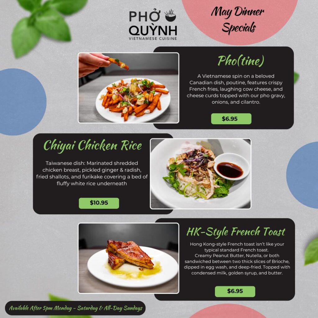 Pho Quynh has changed its dinner specials from something new every week to the same items throughout the month. Here’s what’s available for May after 5 p.m. Monday through Saturday and all day Sunday.