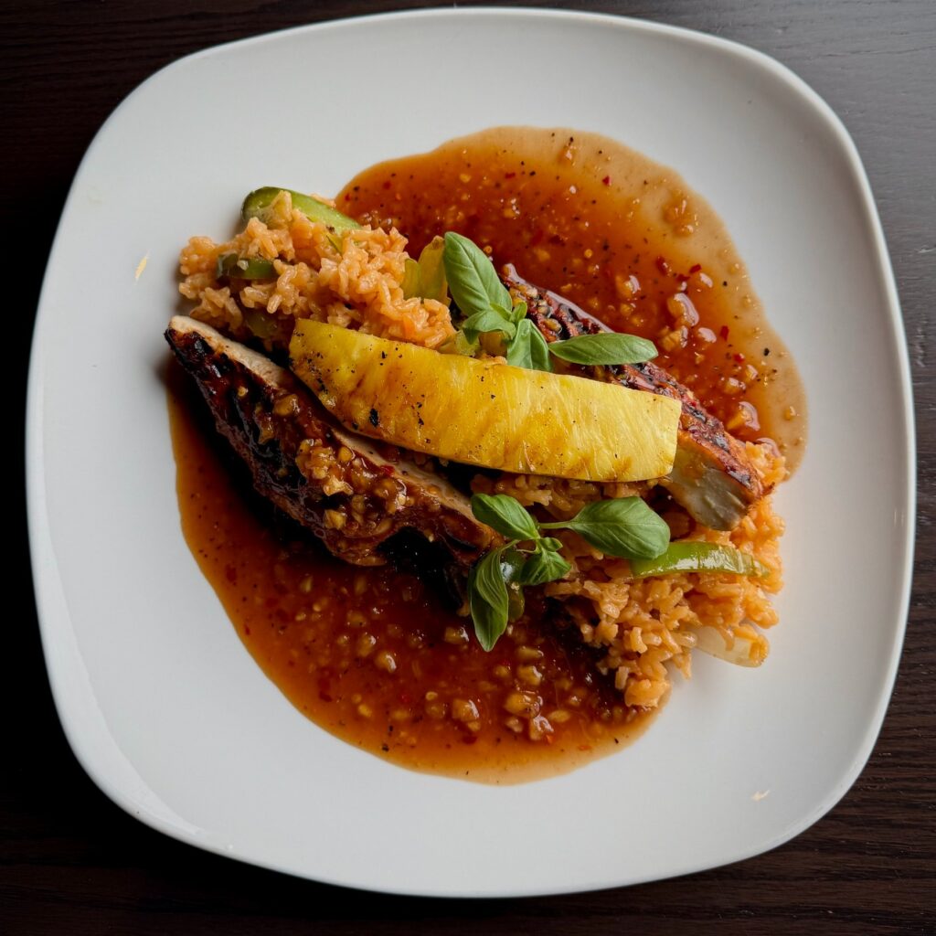 The May dinner feature at R Wine Bar is Pineapple BBQ Chicken. Marinated grilled chicken is served over Spanish rice with bell pepper, onion and broccoli, all topped with a mildly spicy pineapple sauce and a charred pineapple garnish.