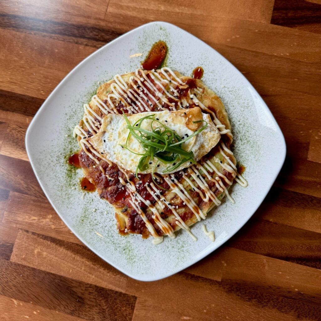The brunch item for R Wine Bar on Saturdays in May is okonomiyaki, a gluten-free, savory Japanese pancake loaded with bacon, cabbage and green onion and topped with an over-easy egg, kewpie mayo and okonomiyaki sauce. It’s available from 11 a.m. to 2 p.m.