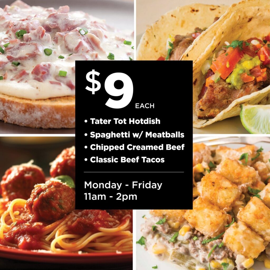 New $9 monthly lunch specials at Railbirds Sports Bar are tater tot hot dish, spaghetti with meatballs, chipped creamed beef and beef tacos. They’re served from 11 a.m. to 2 p.m. weekdays.