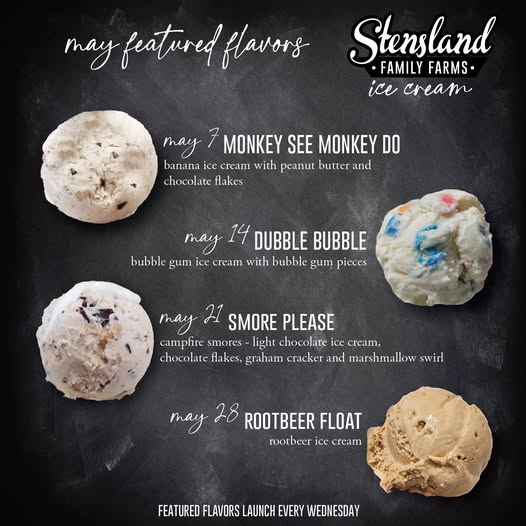 Here are the weekly ice cream flavors for May at Stensland Family Farms.