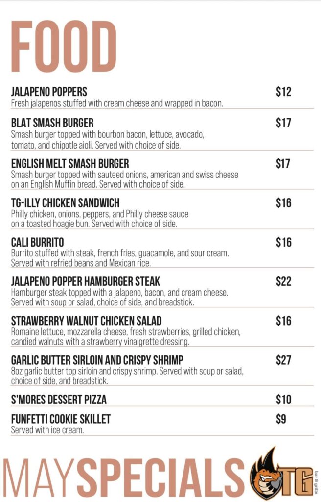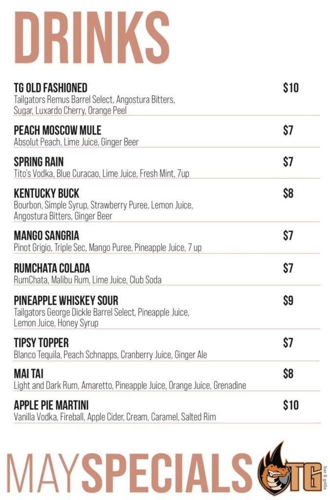 Here are the food and drink menus for May at Tailgators Grill & Bar in Brandon.