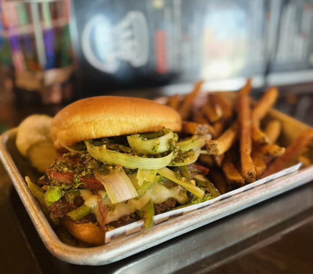 The Dive’s burger of the month is The Bayou. The patty is topped with bell pepper, andouille sausage, chimichurri sauce, Swiss cheese, celery and Cajun aioli.