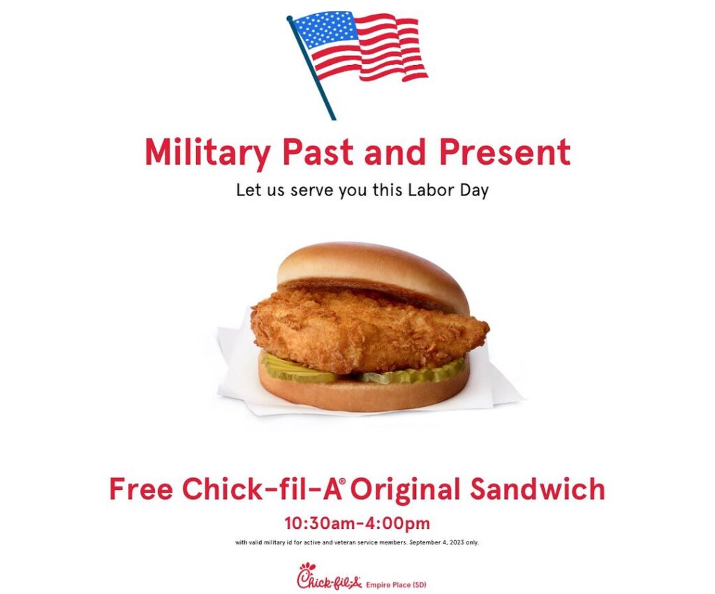 Chick-fil-A is treating veterans and active-duty military to a free sandwich from 10:30 a.m. to 4 p.m. on Labor Day.