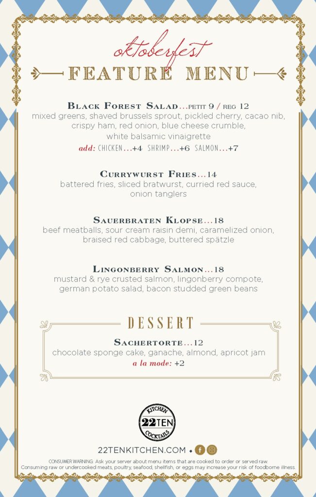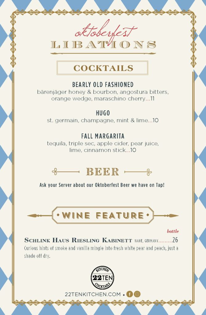 Celebrate Oktoberfest at 22Ten Kitchen Cocktails into next month with its featured food and drink menus.
