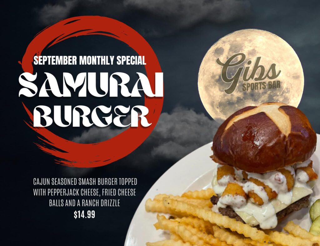 There’s still time to try the September special at Gibs Sports Bar. The Samurai Burger features a Cajun-seasoned patty topped with pepper jack cheese and cheese balls, then covered in a ranch drizzle. It’s served on a pretzel bun with your choice of side.