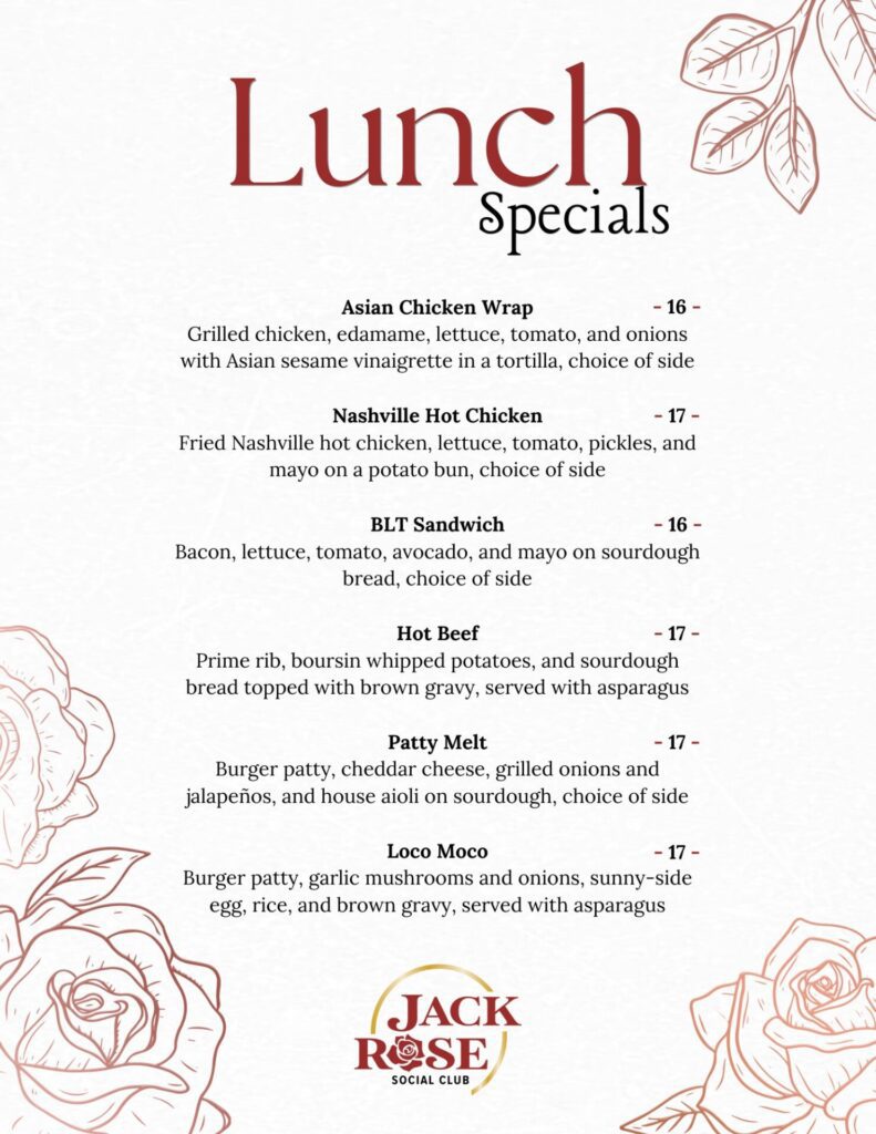 Jack Rose Social Club, the former Tavern 180, has introduced a menu of lunch specials that are available from 11 a.m. to 3 p.m. weekdays. The featured image at the top of the article is the Nashville Hot Chicken sandwich.