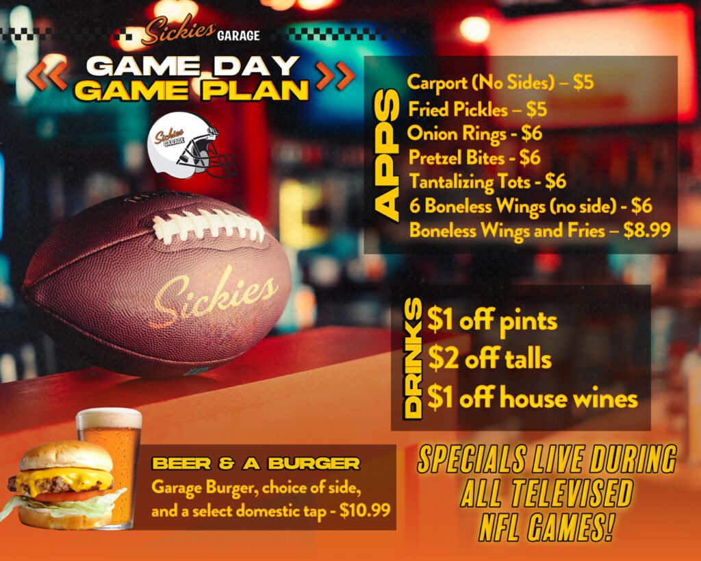 Game day specials at Sickies Garage are available during all televised NFL games.