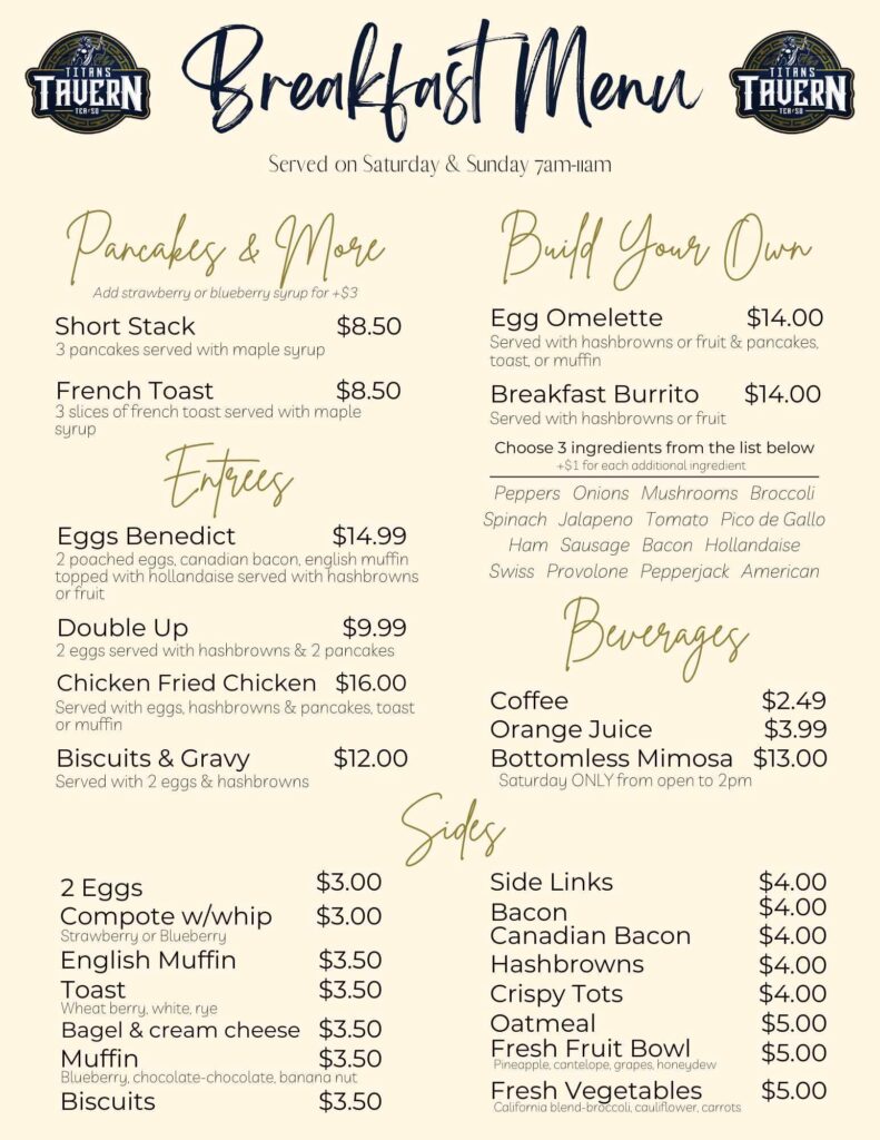 Titans Tavern in Tea has started serving breakfast on the weekend. The menu is available from 7 to 11 a.m. Saturday and Sunday.