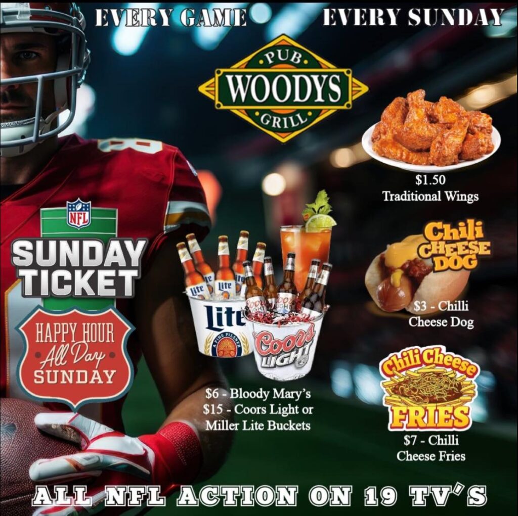 Here’s a look at the Sunday NFL specials at Woodys Pub & Grill.