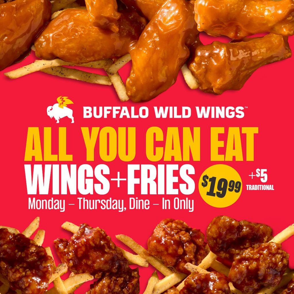 The popular all-you-can-eat wings and fries deal is back for a limited time at Buffalo Wild Wings. This year, there are both boneless wings for $20 and traditional wings for $25. The offer is good Monday through Thursday for dine-in only.