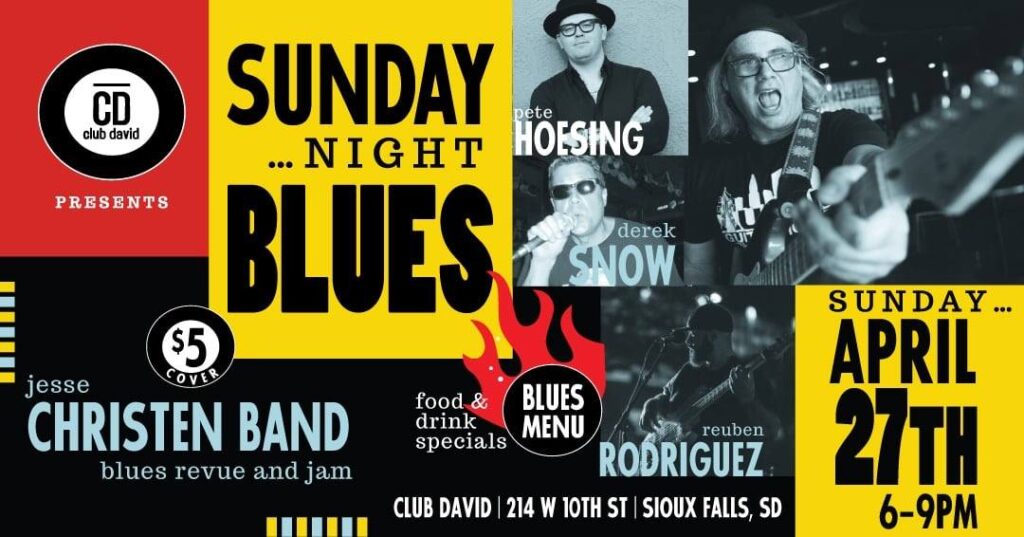 Sunday Night Blues are back this weekend at Club David. In addition to live music, there will be a Southern meal for $20 with ribs, cornbread and slaw. Get banana pudding for $5. Featured cocktails are Lucille Lemonade and Smokestack Lightning. Hours are 6 to 9 p.m., and there’s a $5 cover charge.