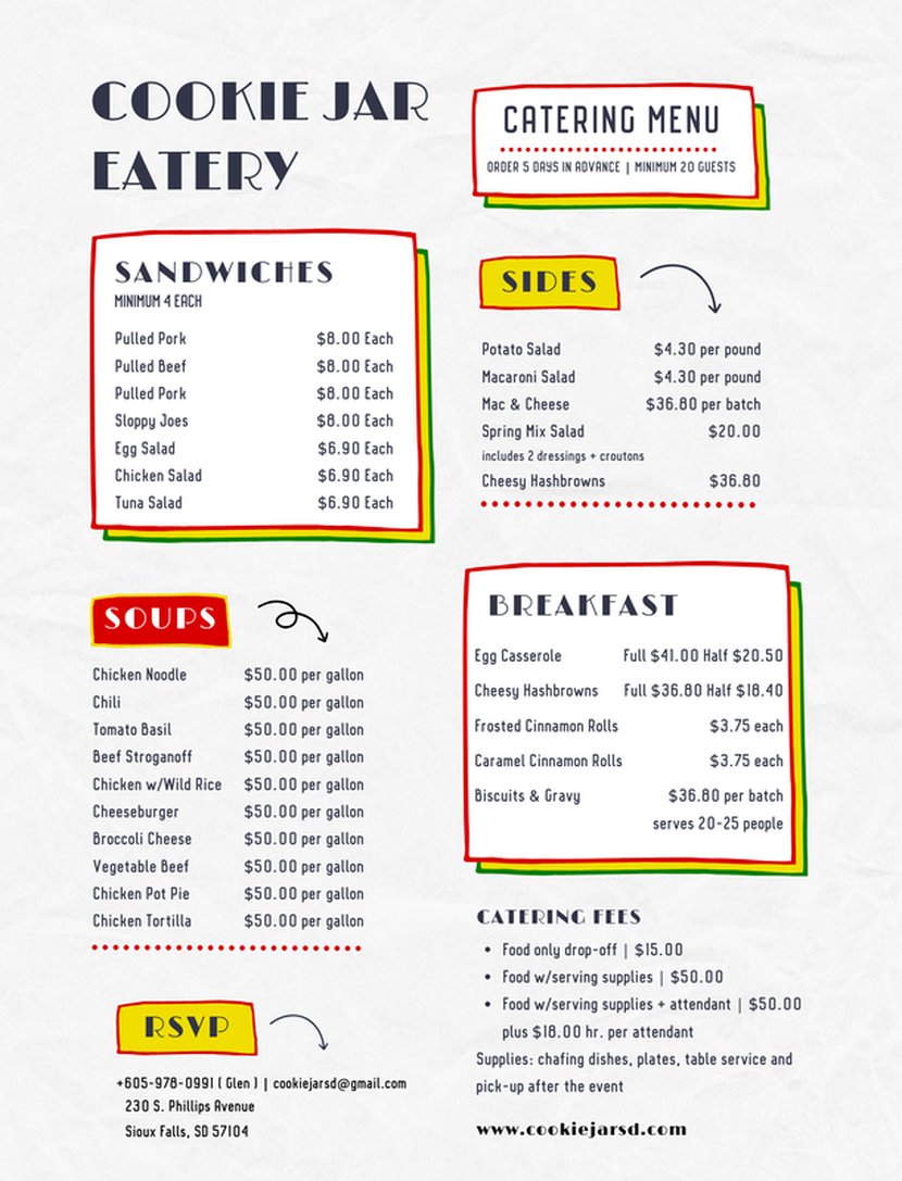 The Cookie Jar Eatery has created a catering menu since it has suspended serving lunch. Before, catering customers just ordered from the lunch menu, said Glen Koch, who owns the longtime bakery with his wife, Elaine. They aren’t sure if they’ll be able to find an employee to help them, so lunch hours remain on hold. Koch said they’ve been keeping busy making cookies and bars to fill the bakery cases and special orders. They do offer grab-and-go lunches with containers of chili and chicken tortilla soup to heat up and tubs of chicken salad and egg salad for making sandwiches.