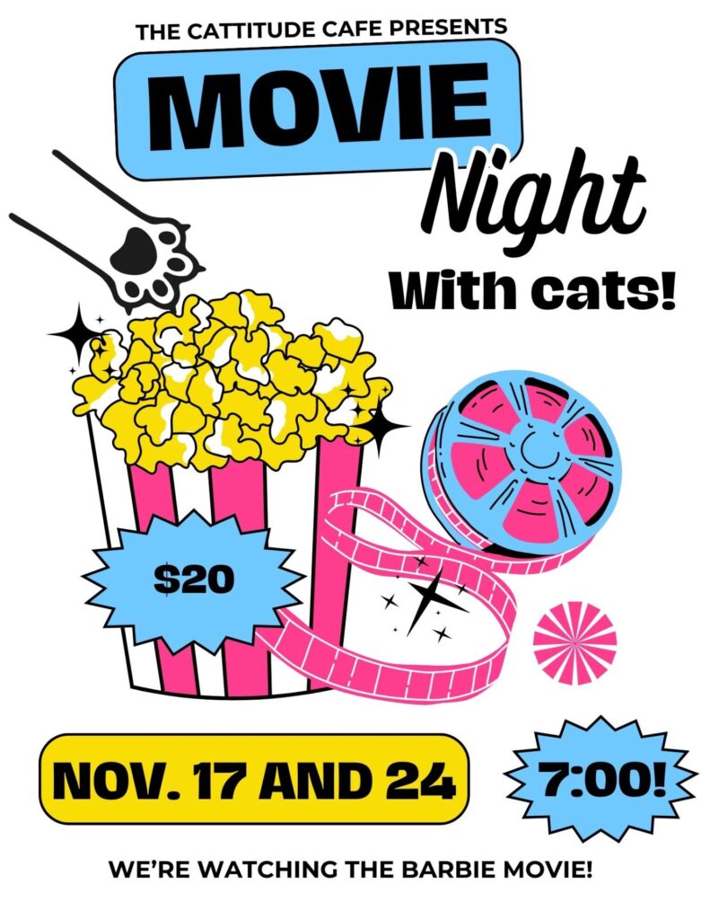 The cafe that features a room where customers can hang out with cats that are available for adoption also is starting movie nights. Every Friday night, Cattitude will show a movie in the cat room at 7 p.m. New movies will be shown every month. Up first: “The Barbie Movie.” Book a spot at thecattitudecafe.com.