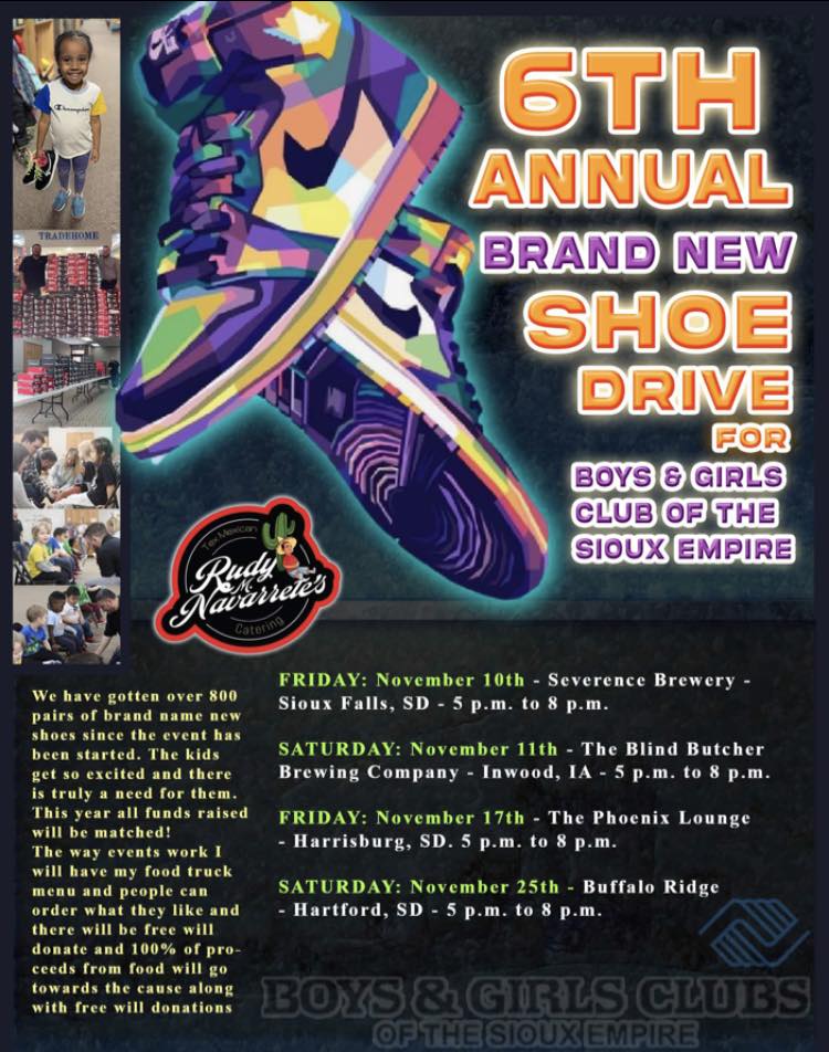 Rudy M. Navarrete’s Tex-Mexican Catering is hosting its sixth annual shoe drive for the Boys & Girls Clubs of the Sioux Empire. Navarrete will serve his food truck menu at four events, and customers’ freewill donations for the food will go to purchase new sneakers. This year, all donations are being matched too. Here are the dates: Friday at Severance Brewing Co.; Saturday at The Blind Butcher Brewing Co. near Inwood, Iowa; Nov. 17 at The Phoenix Lounge in Harrisburg; and Nov. 18 at Buffalo Ridge Brewing Co. in Hartford. Hours are 5 to 8 p.m. More than 800 pairs of brand-name shoes have been donated since the fundraiser started.