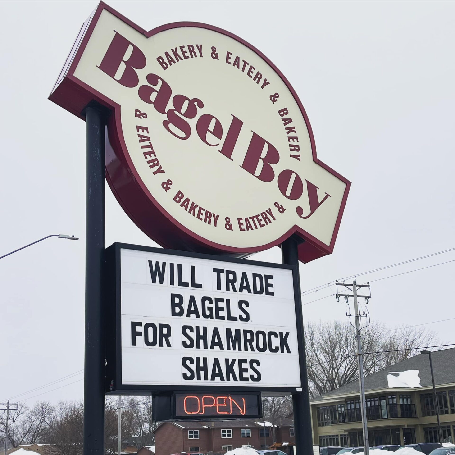 The east-side Bagel Boy used its marquee sign to get a message to its neighbor across the street. “Will trade bagels for Shamrock Shakes” worked. McDonald’s brought over about a half-dozen shakes and got a baker’s dozen plus of bagels in return. After seeing a post about the trade on social media, the B&G Milkyway at Harmodon Park offered a similar trade for Avalanches. That’s in the works, B&G co-owner Andrew Gibbins said.