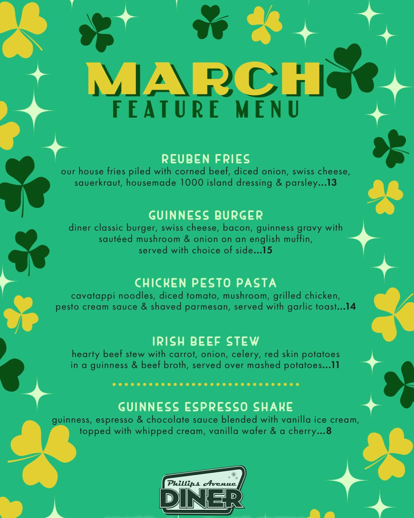 Going all-in for the month that includes St. Patrick’s Day, the features for March have arrived at the Phillips Avenue Diner.