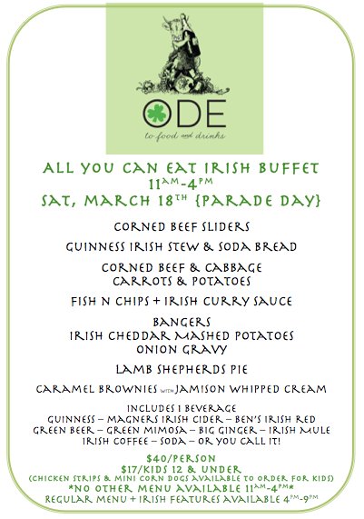 Ode, which is downtown in Cherapa Place, has already started serving its Irish features for St. Patrick’s Day. Through March 18, diners at lunch and dinner will find corned beef and cabbage, fish and chips, and Irish stew. And new this year, there’s an all-you-can-eat Irish buffet from 11 a.m. to 4 p.m. March 18. The dinner menu and Irish features will be served from 4 to 9 p.m.
