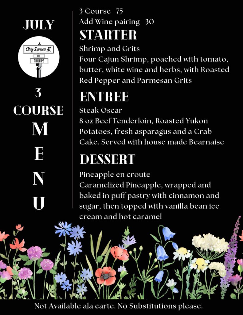 Here’s a look at the three-course menu for July at Chef Lance’s on Phillips. The full menu also is available.