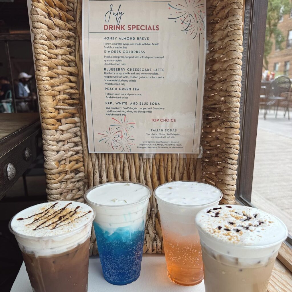 Josiah’s Coffeehouse, Cafe & Bakery has new drink specials for July: Honey Almond Breve, S’mores Coldpress, Blueberry Cheesecake Latte, Peach Green Tea and Red White & Blue Soda. Also shown in the photo are blue raspberry and peach Italian sodas.