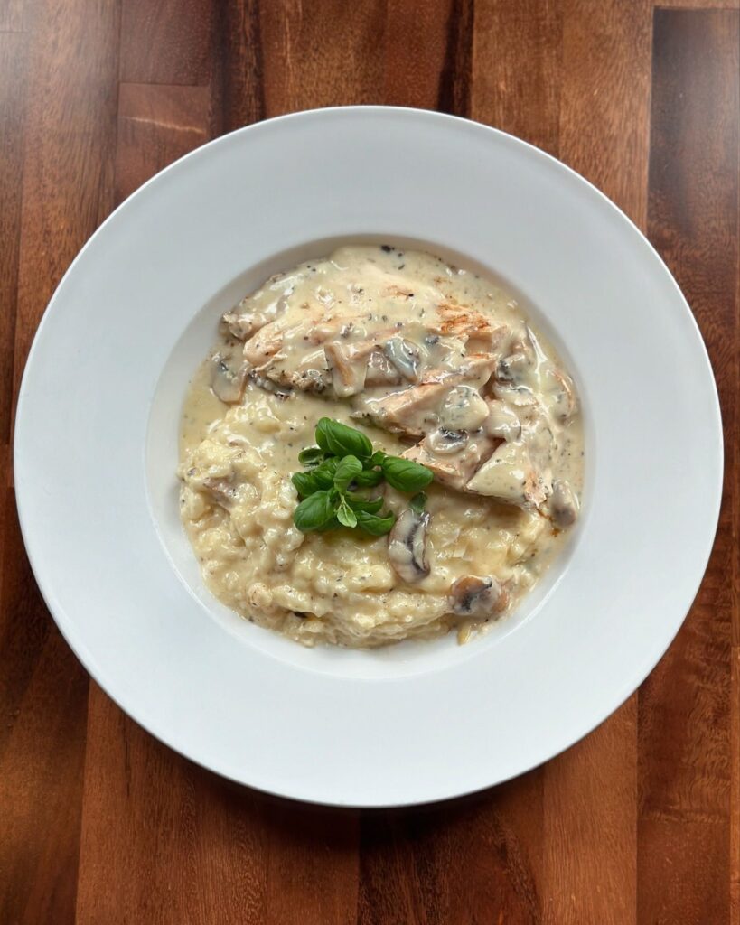 R Wine Bar & Kitchen’s July features include Champagne Chicken, Chocolate Espresso Cheesecake and Berries and Cream Creme Brulee. For lunch, there’s a roast beef sandwich.