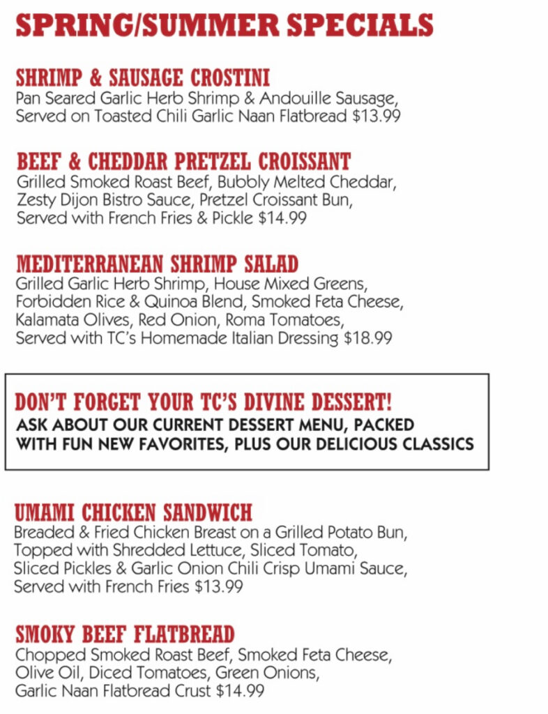 Check out the featured specials menu at T.C.’s Referee Sports Bar & Grill that will be served through summer. The featured photo at the top of the page is the Smoky Beef Flatbread.