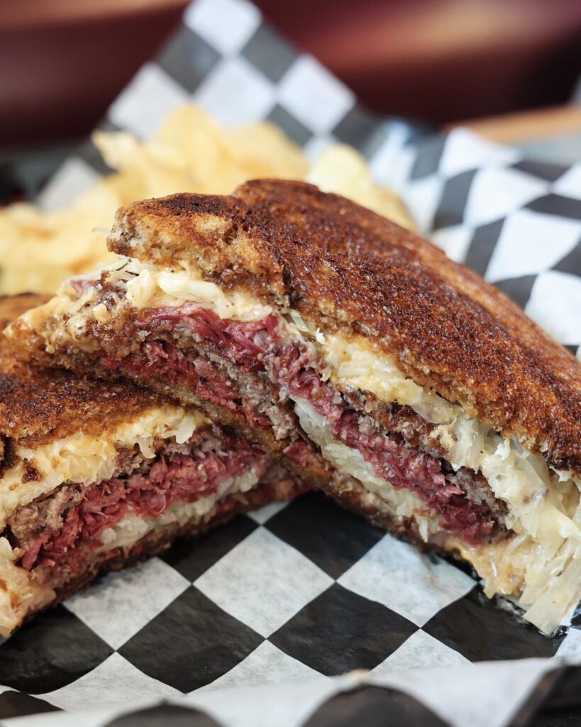 The burger of the month at Big Sioux Burger is the Reuben Burger. Two smash patties are topped with corned beef, Swiss cheese, sauerkraut and Russian dressing, served on griddled rye bread.