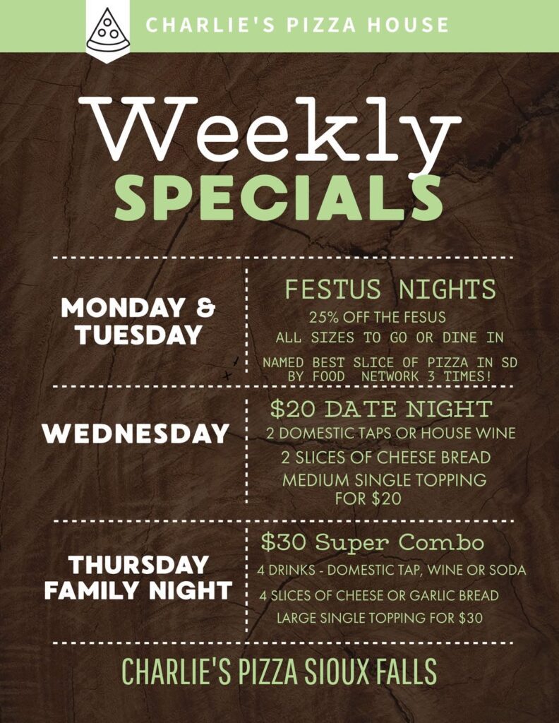 - Sioux Empire Pizza Battle: Charlie’s Pizza won the inaugural competition with the Judy Garland. It has alfredo sauce, spinach, bacon, chicken, roma tomatoes and garlic, finished with Parmesan and sweet balsamic glaze. The restaurant will keep making the pizza when the ingredients are available. Each of the 11 restaurants donated a portion of proceeds to charity. Charlie’s recipient was Emily’s Hope.