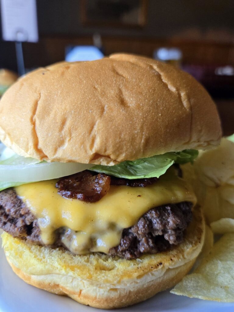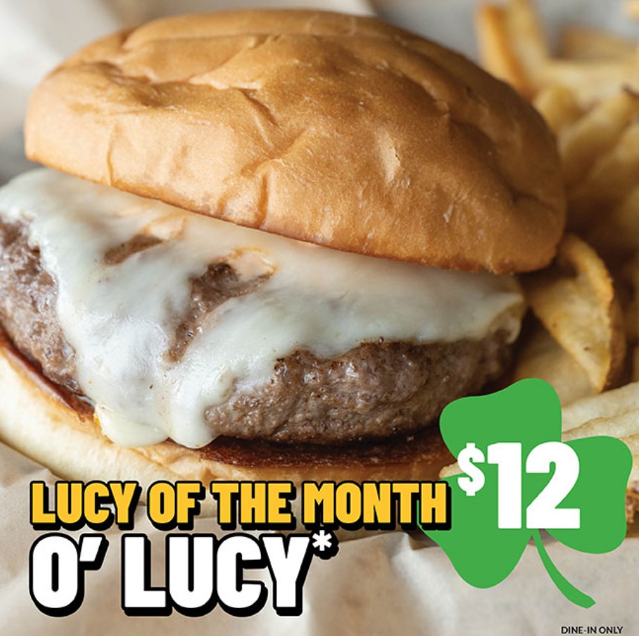 The March lucy of the month at Crooked Pint Ale House is the O’Lucy. The patty is stuffed with corned beef, Swiss cheese and sauerkraut. It’s topped with more Swiss cheese and Thousand Island dressing.