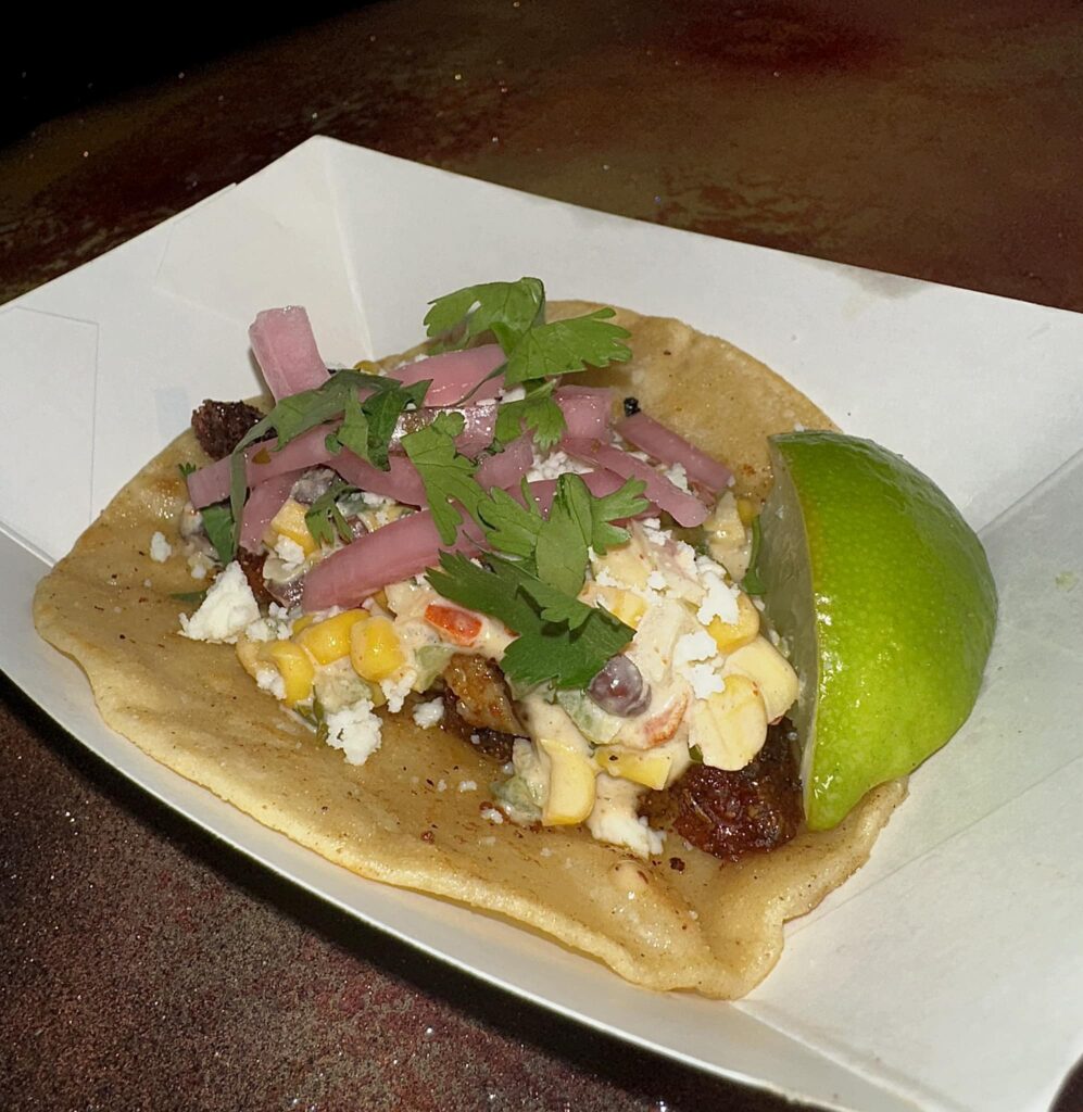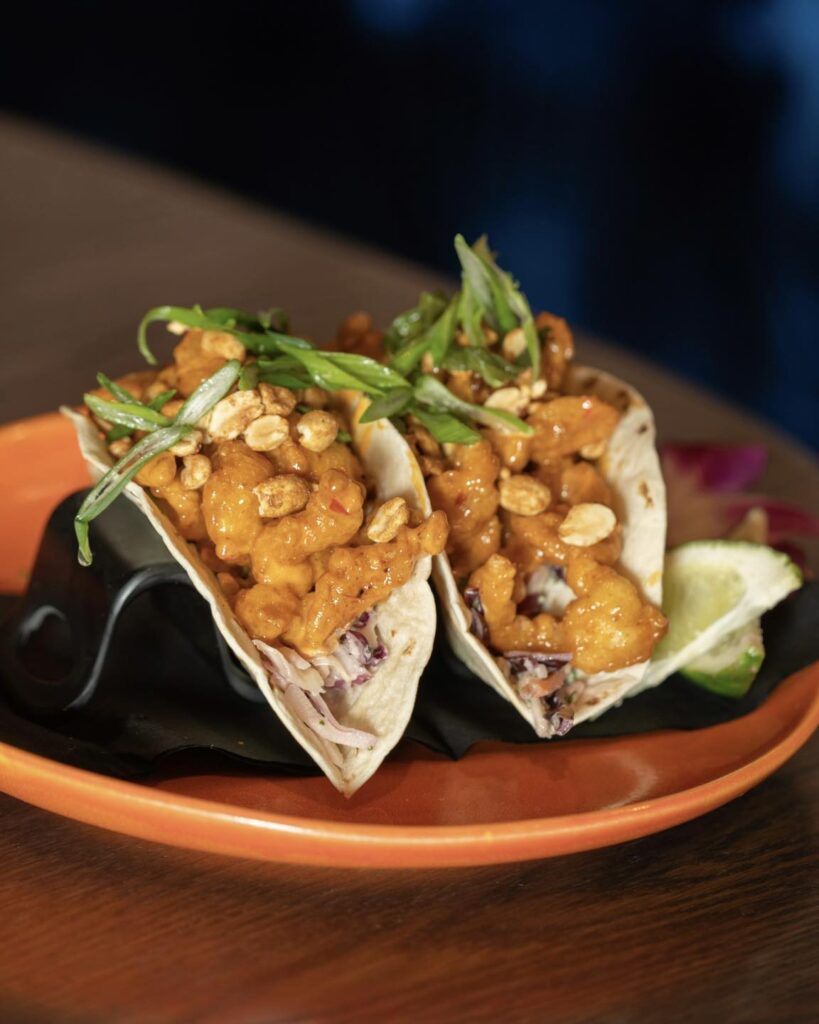 Next door at Dahlia Kitchen + Bar, the taco of the month is Bang Bang Shrimp. A soft shell tortilla is stuffed with tempura shrimp tossed in bang bang sauce, with napa cabbage slaw, peanuts and green onion.