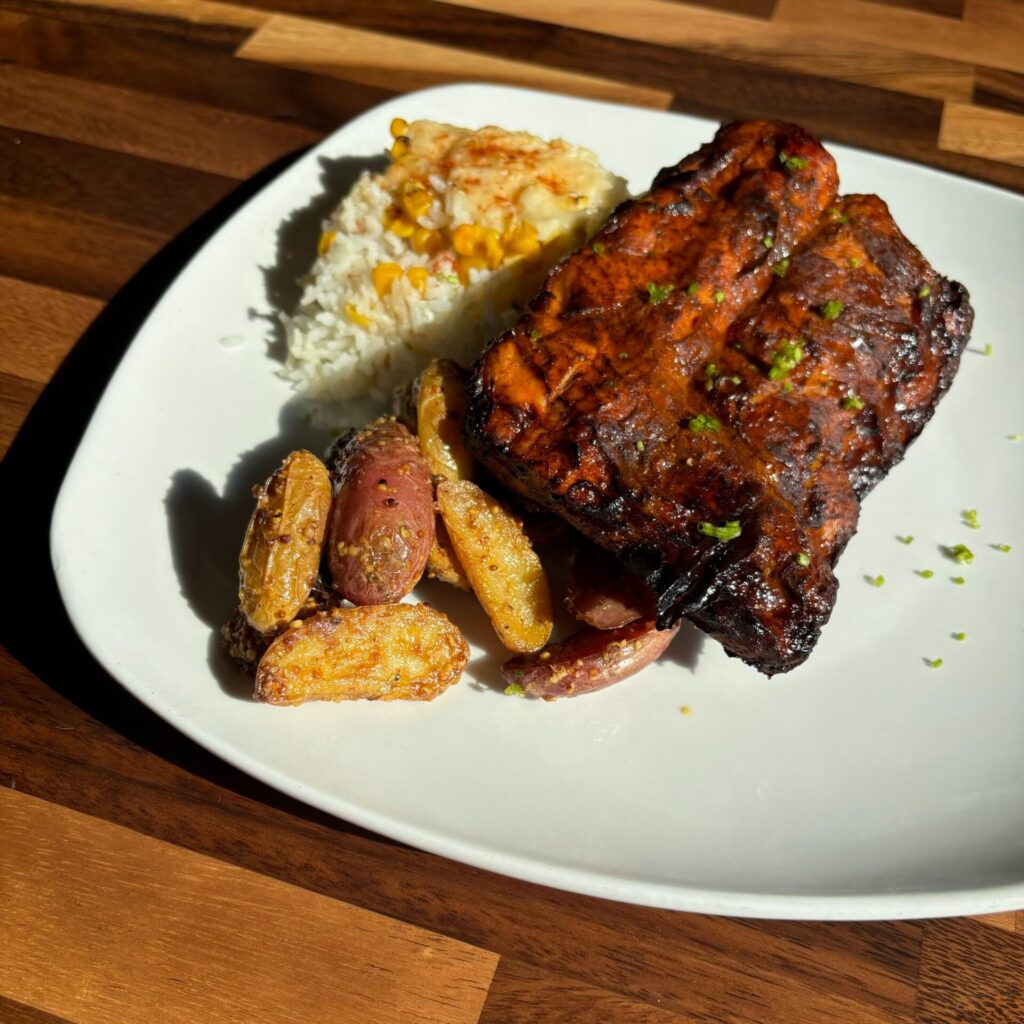 The March special at R Wine Bar & Kitchen is Adobo Pork Ribs. They’re paired with mustard seed fingerling potatoes and baked corn cheesy rice.