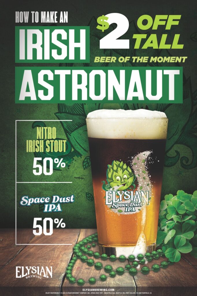The Beer of the Moment for March at Sickies Garage Burgers & Brews is a themed for St. Patrick’s Day. The Irish Astronaut, a twist on a black and tan, features Elysian Brewing’s Nitro Irish Stout on top of Space Dust IPA. Get $2 off a tall.