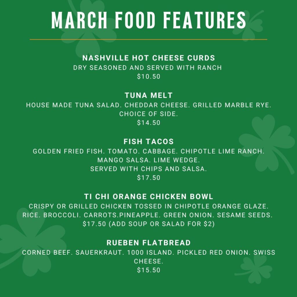 March specials are available Monday through Thursday at the Hartford Steak Co. Tavern in Hartford. Get a hamburger for $7 or cheeseburger for $8, each served with chips.