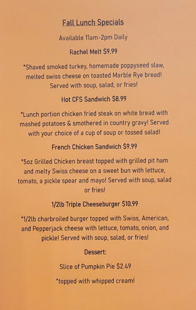 Check out the new fall lunch specials at Crack’d Pot Restaurant. They’re available every day from 11 a.m. to 2 p.m.